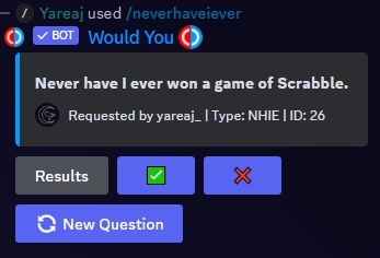 Using the /neverihaveever command you will prompt the bot to send you a Never I have ever-style question in which everyone can participate by using the interaction buttons.